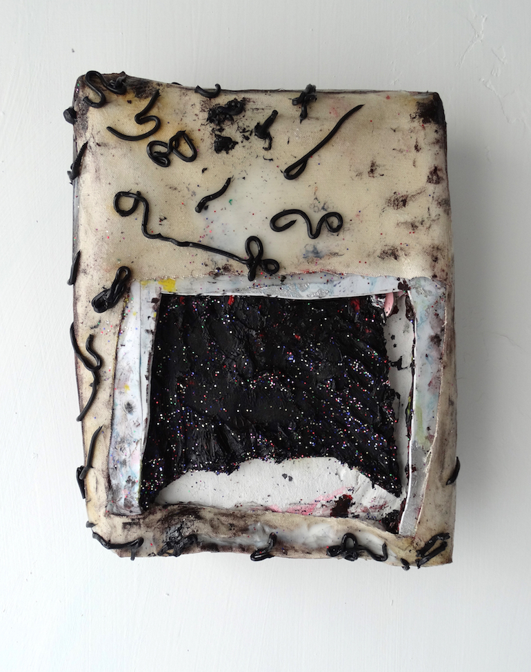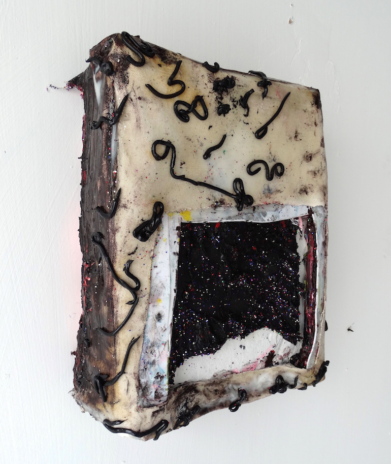 666 2016. oil paint, gesso, acrylic,silver leaf, foam paper, on canvas adhered to wood panel. 14in x 11.5in x 3in
