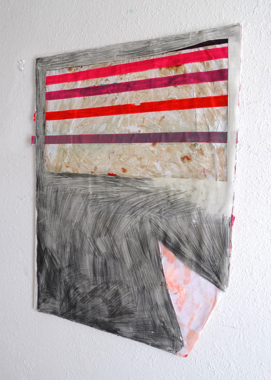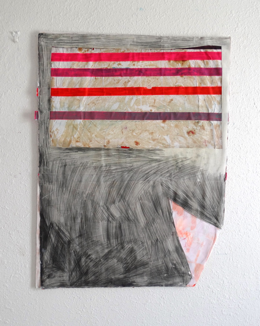 Fonda 2016. graphite, gaff tape, oil stick, and sekashu adhered to wood surface.. 27in x 24in