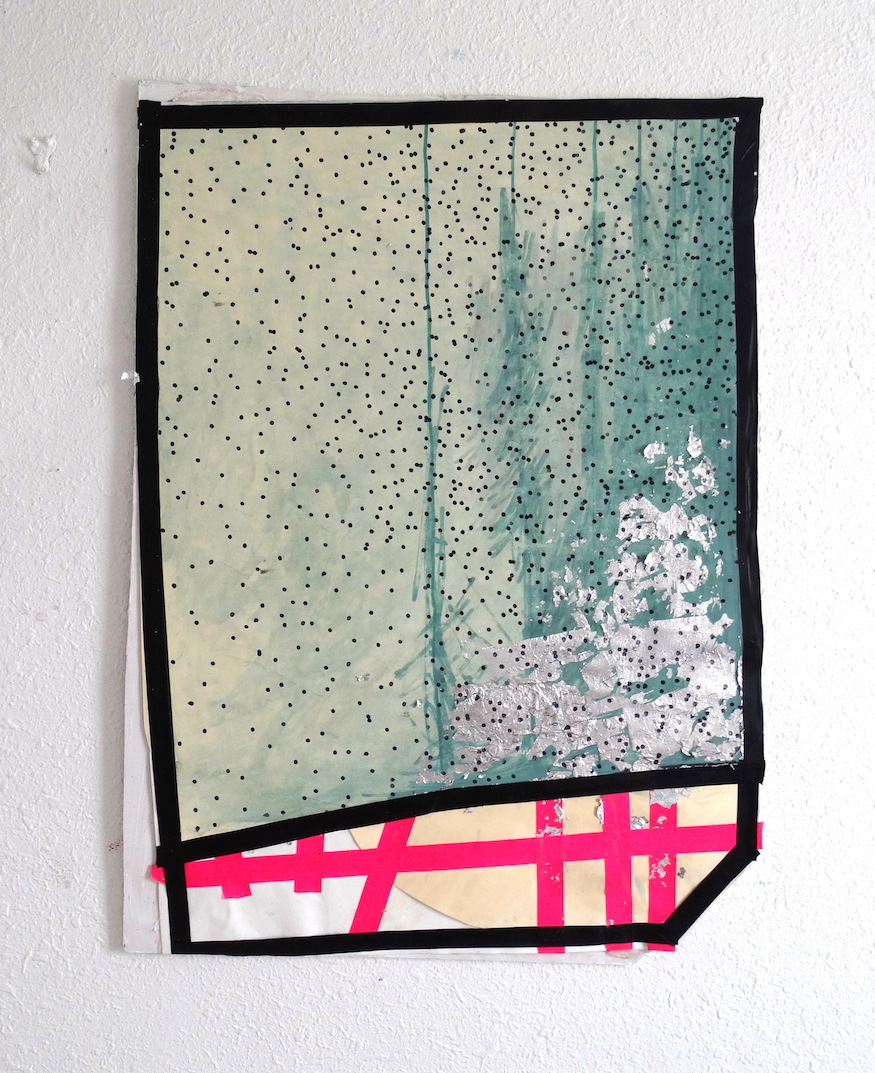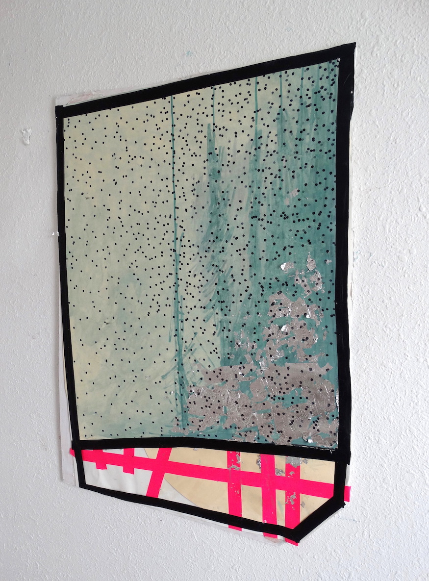 Gerty 2016. silver leaf, gaff tape, marker, arches paper, and manilla adhered to wood surface. 27in x 25in