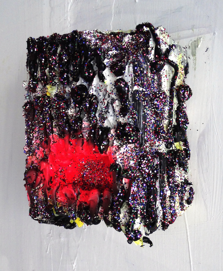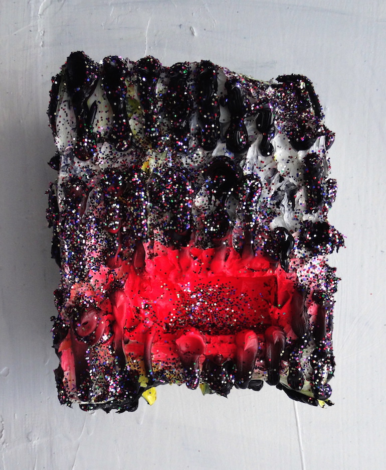 Golden Dawn 2016. gesso, acrylic, sparkles, oil paint, and super gel on canvas adhered to wood panel. 9in x 7in x 5in
