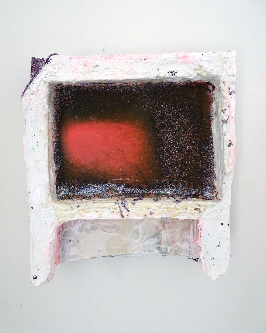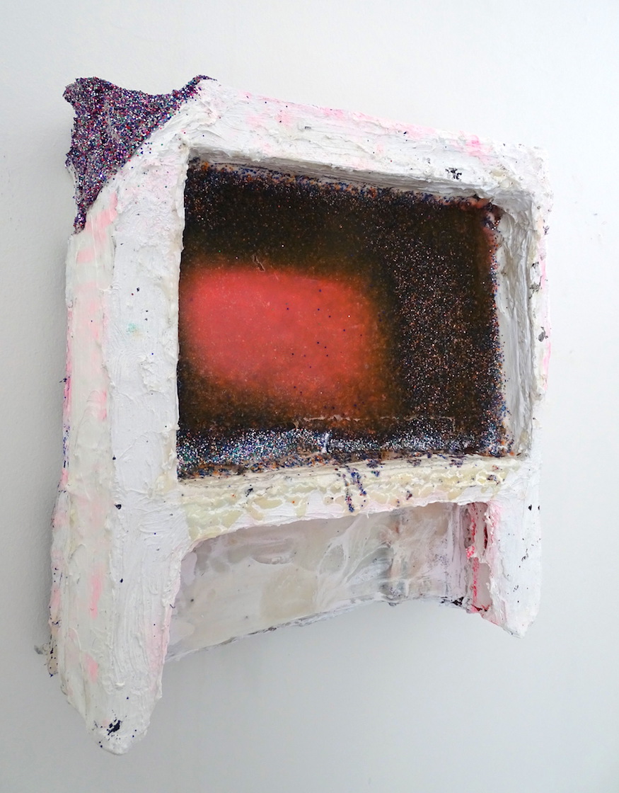 Jailbroke 2018.acrylic medium, sparkles, oil paint, and canvas on wood panel. 18in x 18in x 7in