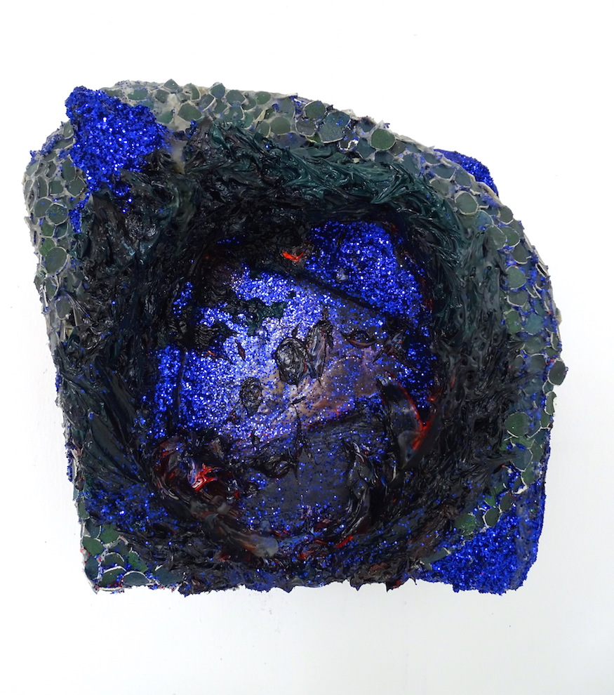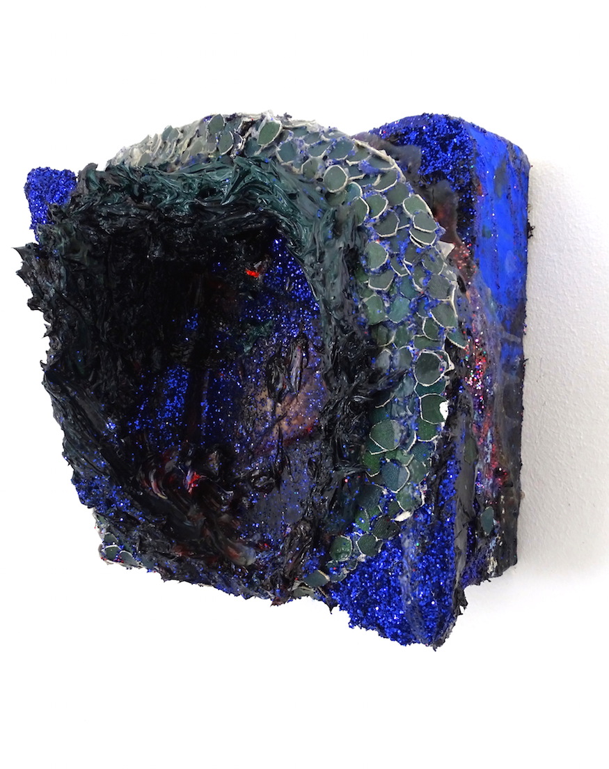 Jolene 2018. acrylic, oil paint, sparkles, and canvas on wood panel. 14in x 12in x9in