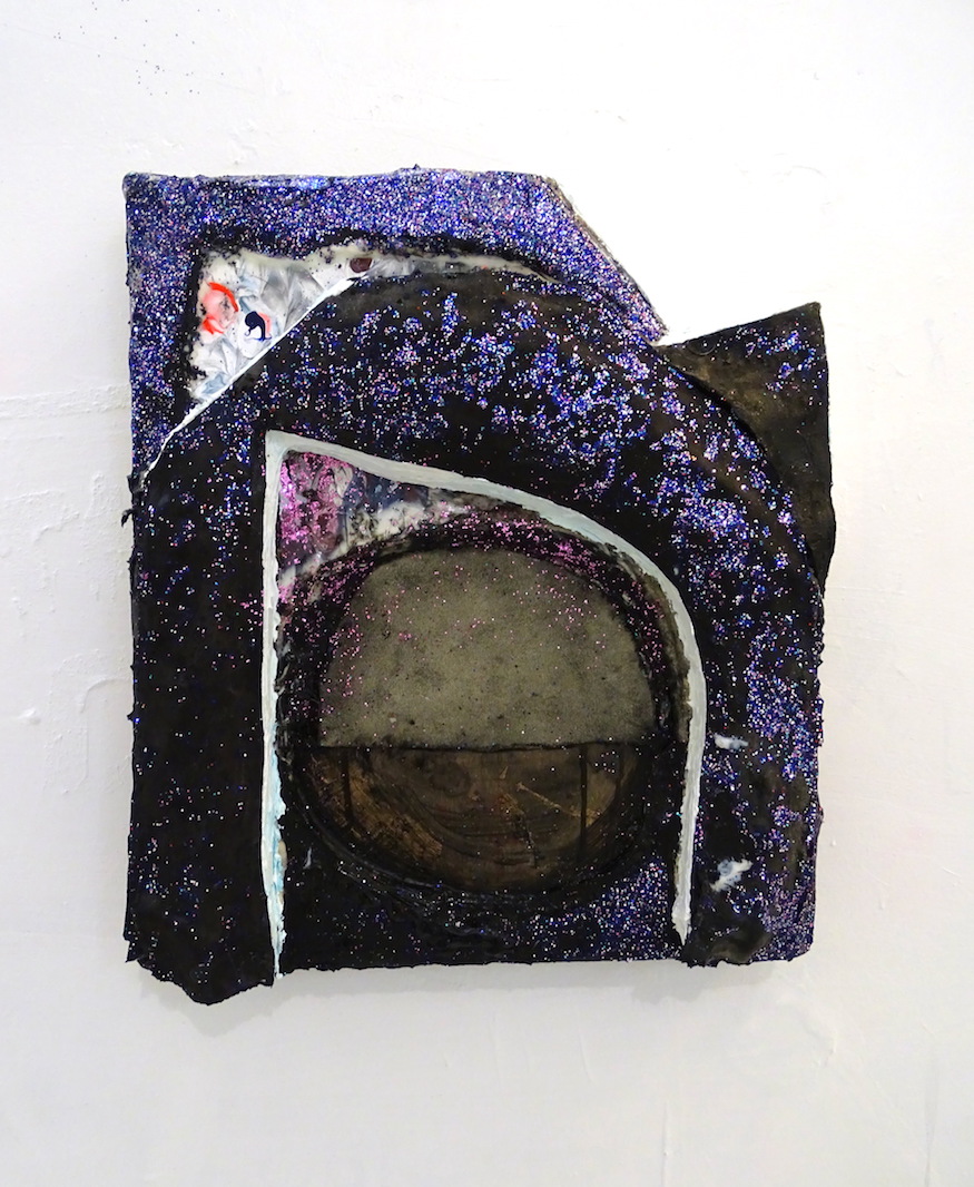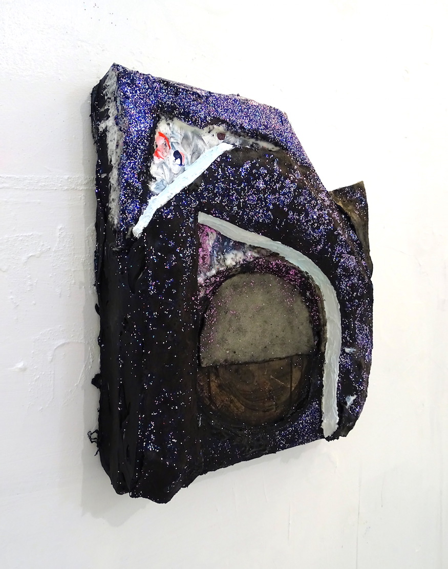Judge 2016. acrylic, oil paint, sparkles, gesso, and canvas on canvas adhered to wood panel. 22in x 19in x 5in