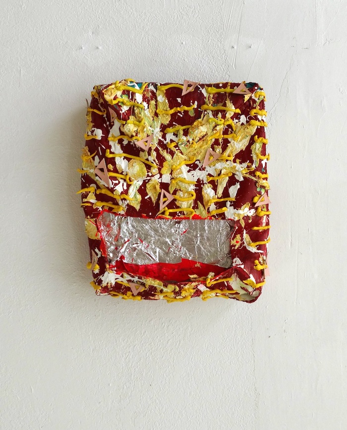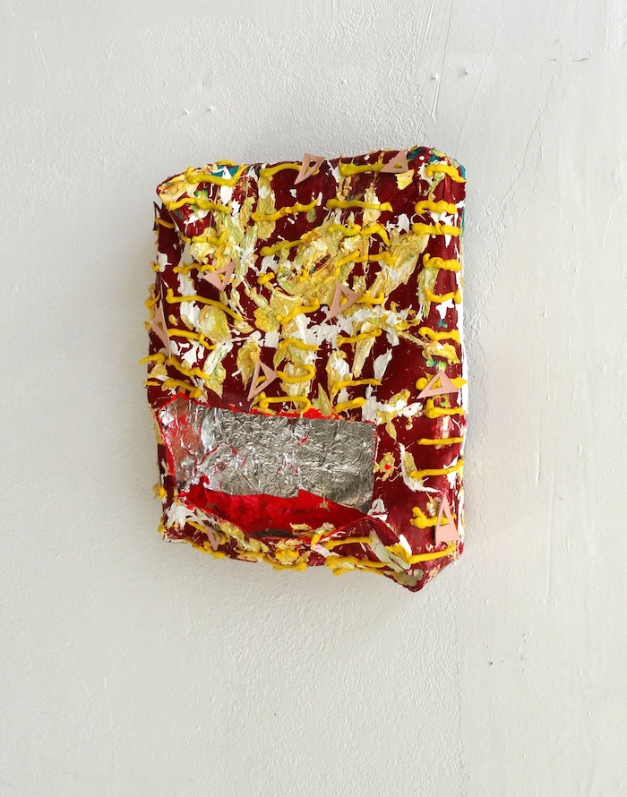 Nacho 2014. oil paint, acrylic, silver leaf, and canvas on canvas adhered to wood panel. 15in x 13in