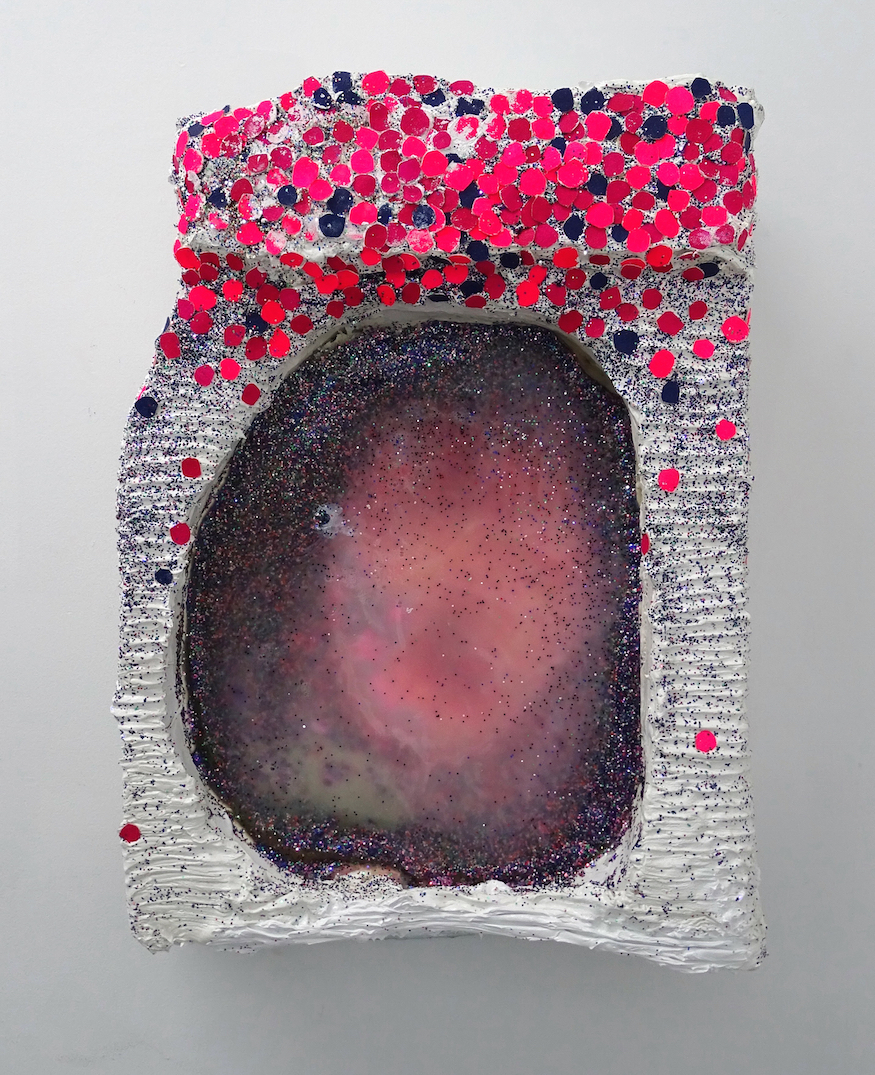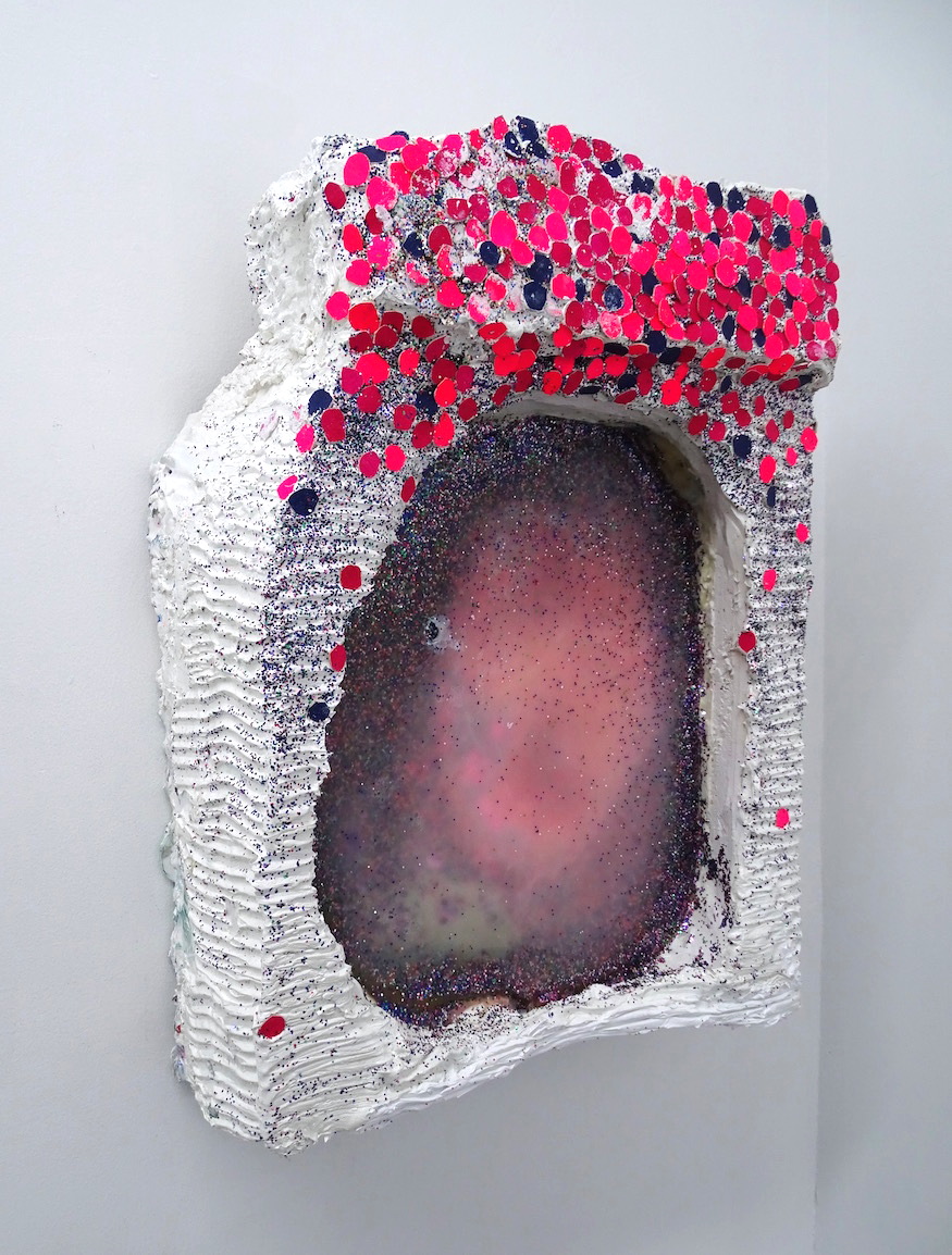 Party Cake 2018. oil paint, acrylic medium, canvas, and sparkles on wood panel. 22in x 16in x 8.5in