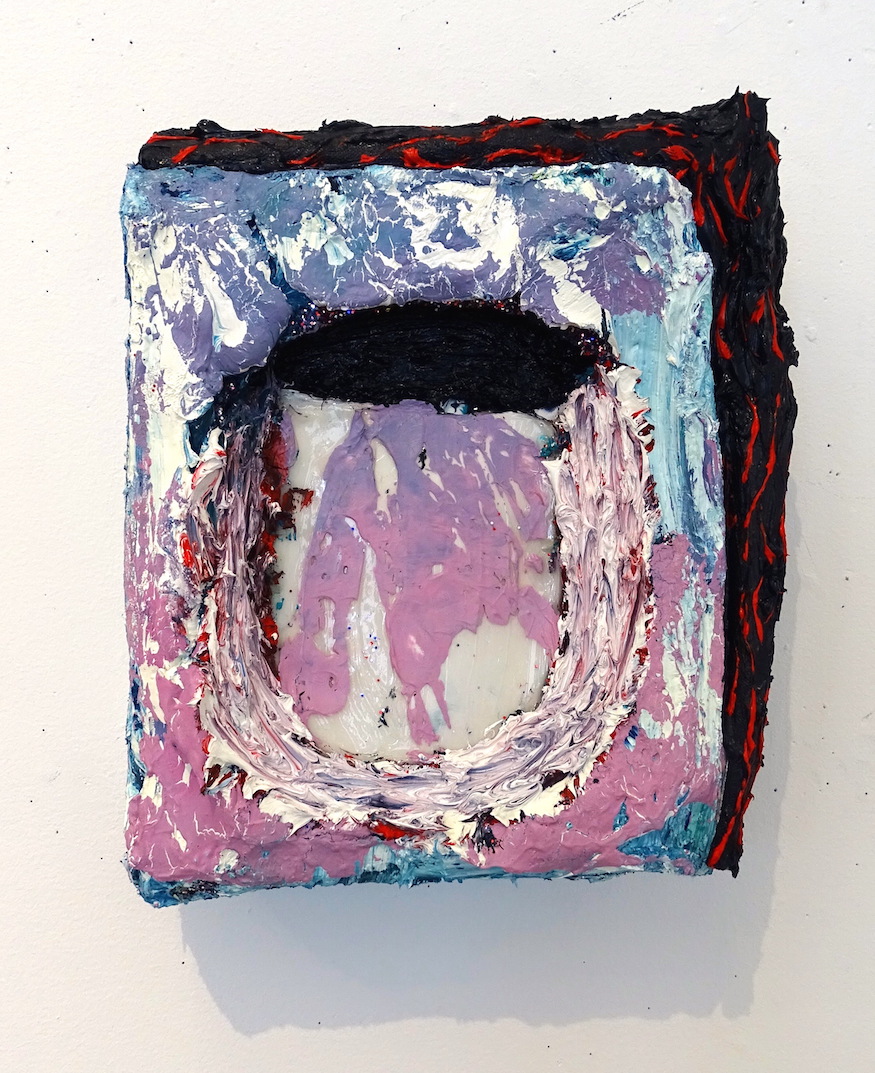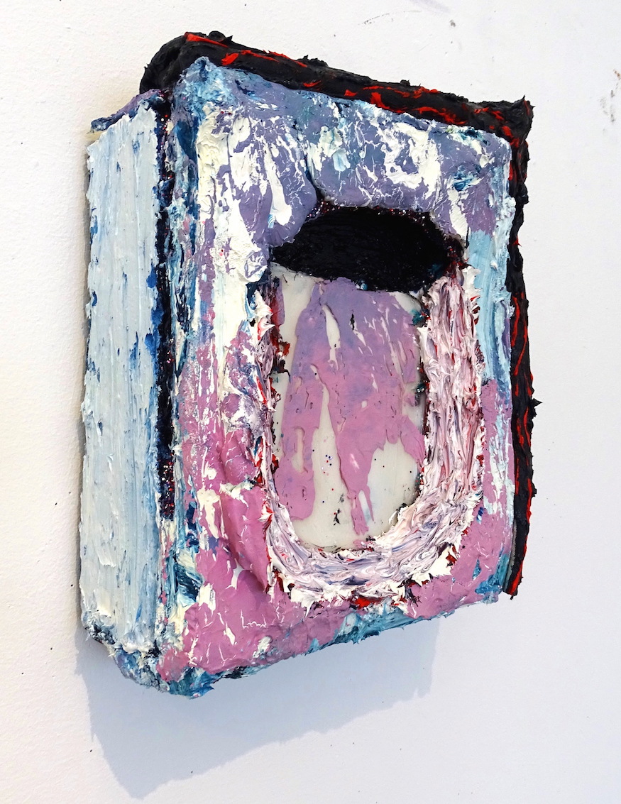 humbug 2016. oil paint, gesso, acrylic,silver leaf, foam paper, on canvas adhered to wood panel. 14in x 11.5in x 3in